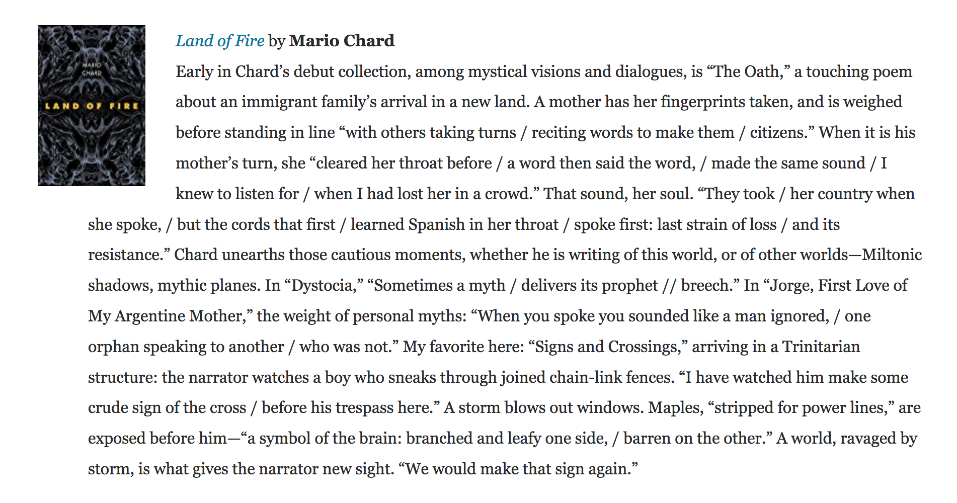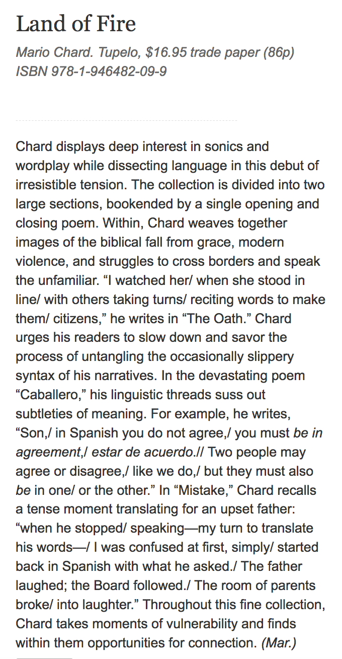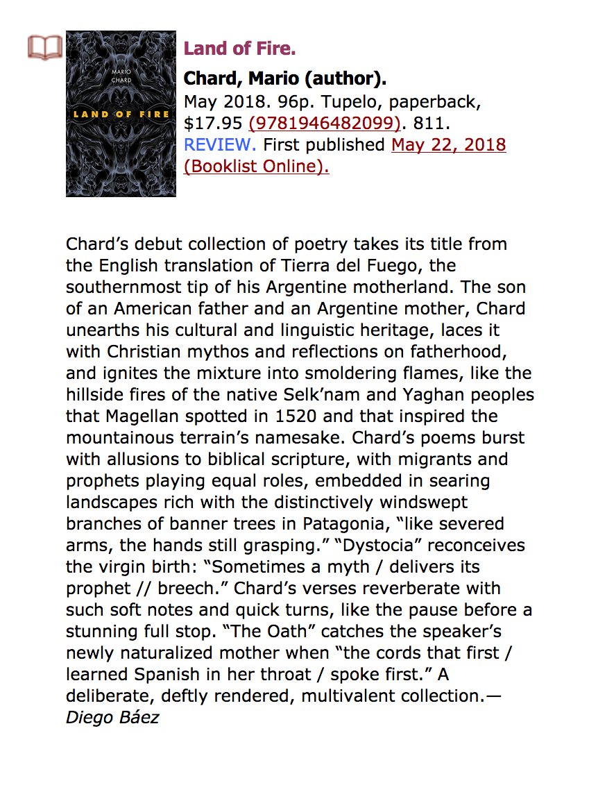 “Mario Chard’s outstanding debut, Land of Fire, examines the ideas of citizen and alien, of national borders and of other, stranger ways we encounter and escape the confines that keep us. The book revolves around the series “Caballero”, a mythologization of the fate of a group of undocumented immigrants whose van crashed—according to differing news reports, either from swerving to miss a horse, or due to the driver molesting a passenger. This poem hinges on the command say, as in “Say it was a horse. / That the horse watched / the three ton van / roll…” That the command exists with one foot in imagine and one foot in declare gets at the book’s heart: an uneasy and reverent reckoning with what breaking silence brings into being. In short, Land of Fire is a careful, faceted meditation on what is sayable, what is unspeakable, and what barriers can be crossed with acts of witness and acts of imagination. It is a book that every day becomes more necessary.”